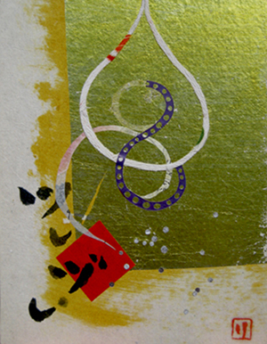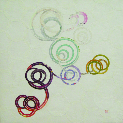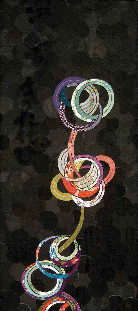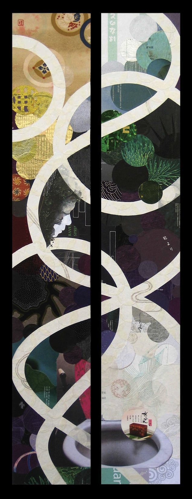 Contemporary oriental collage art made with only discarded paper and fabric that Rie finds on her journeys. It is her foot prints and shows her life stories.